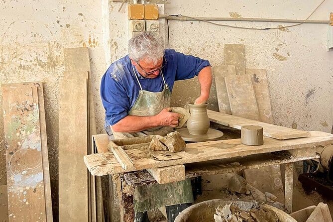 Passeggiando per le strade del borgo medievale di Camerota, ci si imbatte nel laboratorio di Pompeo, nel quale si tramanda da generazioni l’arte della lavorazione dell’argilla che affonda le sue radici nell’Antica Grecia. Dal laboratorio si fa presto ad arrivare al suo negozio. Il punto vendita affaccia su piazza San Vito, all’ingresso del paese. Gli scaffali sono pieni di opere bellissime. Pompeo spiega ai visitatori i vari usi che possono essere fatti con quella brocca, oppure con quella «quartuccia». Ci sono contenitori per l’olio, per il vino, posaceneri, vasi, brocche di ogni dimensione, ma anche presepi, animaletti e ceramiche decorate stile vietrese. La moglie di Pompeo, Antonia, è colei che dà vita e colori alle creazioni. Mano ferma e tempere diverse. Mischia, bagna con l’acqua, sfuma. È lei che completa le bellezze pensate dal marito.